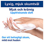 Tork Exklusiv Skumtvål är en rik, löddrande tvål med en diskret doft för en lyxig handtvätt. Den är skonsam mot huden och har genomgått dermatologiska tester. Den har ett rikt lödder och lämnar din hud mjuk och len.
