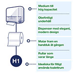 Tork Matic® Dispenser Handduk på rulle Vit H1: Tillhandahåll en bra upplevelse i välbesökta toalettutrymmen med denna dispenser för handduk på rulle som vann iF Product Design Award och Red Dot Award 2009. Minska avfallet genom att reglera förbrukningen av handdukar och förbättra hygienen med hjälp av utmatningen av en handduk i taget – det gör att användare endast vidrör de handdukar som de behöver. Dispensern har en modern Elevation-design och hög kapacitet för att passa välbesökta utrymmen. Den är även enkel att rengöra och har ett dubbelt låssystem för enklare underhåll.