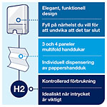 Tork Xpress® Dispenser Multifold Handduk vit H2: Imponera på gästerna i toalettutrymmen med låg till medelhög besöksfrekvens med det eleganta utseendet på Tork Xpress® Dispenser Multifold Handduk. Minska dessutom avfallet och förbättra dina miljömeriter med hjälp av utmatningen av en handduk i taget, vilket innebär minskad förbrukning och förbättrad hygien. Din personal kommer också att uppskatta färre påfyllningar – den här dispenser har en hög kapacitet som rymmer upp till 2,5 buntar, vilket innebär att fler användare kan betjänas.