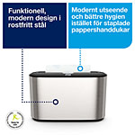 ...handdukar. Den eleganta, slimmade designen kompletterar ett exklusivt toalettutrymme med sitt prisbelönta utseende. Utmatningen av en handduk i taget förbättrar hygienen och uppmuntrar till minskad förbrukning eftersom gästerna bara rör handdukarna de behöver. Dispenserns borstade rostfria stål har ett hölje som skyddar mot fingeravtryck för enklare underhåll. Dessutom går den att fylla på snabbt tack vare öppningen på sidan. Koldioxidneutral – tillverkad med certifierad förnybar el och kompenserad med klimatprojekt.