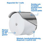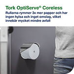 Tork OptiServe® Dispenser Coreless Toalettpapper 1 rulle Rostfritt stål T7: Tork OptiServe® Coreless är ett system med hög kapacitet för toalettpapper utan hylsa som passar för anläggningar där effektivitet, hållbarhet och en utmärkt upplevelse är av största vikt. Hög kapacitet, minskad förvaringsplats och en design som är Easy to use-certifierad gör det till ett bättre alternativ än vanligt toalettpapper och jumborullar. Denna dispenser för en rulle toalettpapper är del av ett brett sortiment som möter behoven i olika toalettutrymmen, så att samma kompakta refiller för toalettpapper kan användas i hela anläggningen. Jämfört med vanligt toalettpapper rymmer Tork OptiServe® Coreless rullar 3 gånger mer papper eftersom de varken har hylsa eller omslag, vilket innebär mindre avfall.