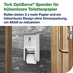 ...hållbarhet och en utmärkt upplevelse är av största vikt. Hög kapacitet, minskad förvaringsplats och en design som är Easy to use-certifierad gör det till ett bättre alternativ än vanligt toalettpapper och jumborullar. Dessa 2-lagers toalettrullar utan hylsa passar en rad olika dispensrar för toalettpapper utan hylsa för att möta behoven i olika toalettutrymmen, så att samma kompakta refiller för toalettpapper kan användas i hela anläggningen. Jämfört med vanligt toalettpapper rymmer Tork OptiServe® Coreless rullar 3 gånger mer papper eftersom de varken har hylsa eller omslag, vilket innebär mindre avfall.