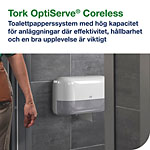 ...hållbarhet och en utmärkt upplevelse är av största vikt. Hög kapacitet, minskad förvaringsplats och en design som är Easy to use-certifierad gör det till ett bättre alternativ än vanligt toalettpapper och jumborullar. Dessa 2-lagers toalettrullar utan hylsa passar en rad olika dispensrar för toalettpapper utan hylsa för att möta behoven i olika toalettutrymmen, så att samma kompakta refiller för toalettpapper kan användas i hela anläggningen. Jämfört med vanligt toalettpapper rymmer Tork OptiServe® Coreless rullar 3 gånger mer papper eftersom de varken har hylsa eller omslag, vilket innebär mindre avfall.