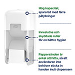...passar anläggningar där effektivitet, hållbarhet och en utmärkt upplevelse är av största vikt. Hög kapacitet, minskad förvaringsplats och en design som är Easy to use-certifierad gör det till ett bättre alternativ än vanligt toalettpapper och jumborullar. Denna dispenser för två rullar toalettpapper är del av ett brett sortiment som möter behoven i olika toalettutrymmen, så att samma kompakta refiller för toalettpapper kan användas i hela anläggningen. Jämfört med vanligt toalettpapper rymmer Tork OptiServe® Coreless rullar 3 gånger mer papper eftersom de varken har hylsa eller omslag, vilket innebär mindre avfall.