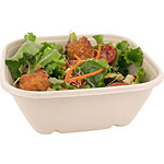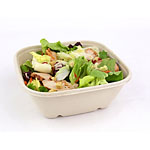 Formar i fibermaterial som kan användas till både varm och kall mat. Materialen pulp och bagasse är förnybara restprodukter från jordbruket. De formar som dessutom har PLA-beläggning har extra tålighet mot väta (se materialfältet).