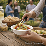 Assiett från DeliQ i fibermaterialet bagasse som tillverkas av restfibrer från sockerrör. Materialet är stabilt, formfast och klarar både varma och kalla rätter utan